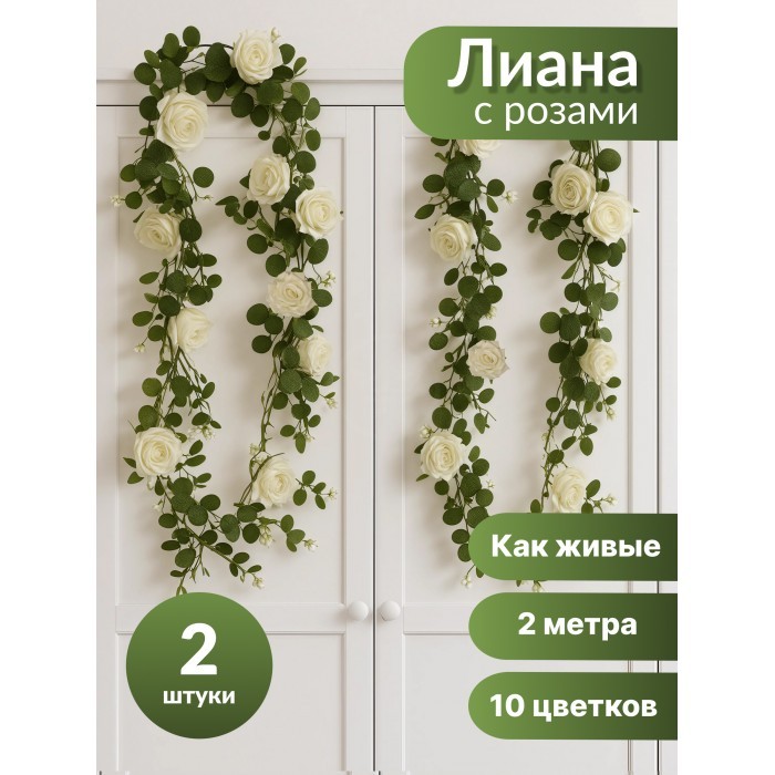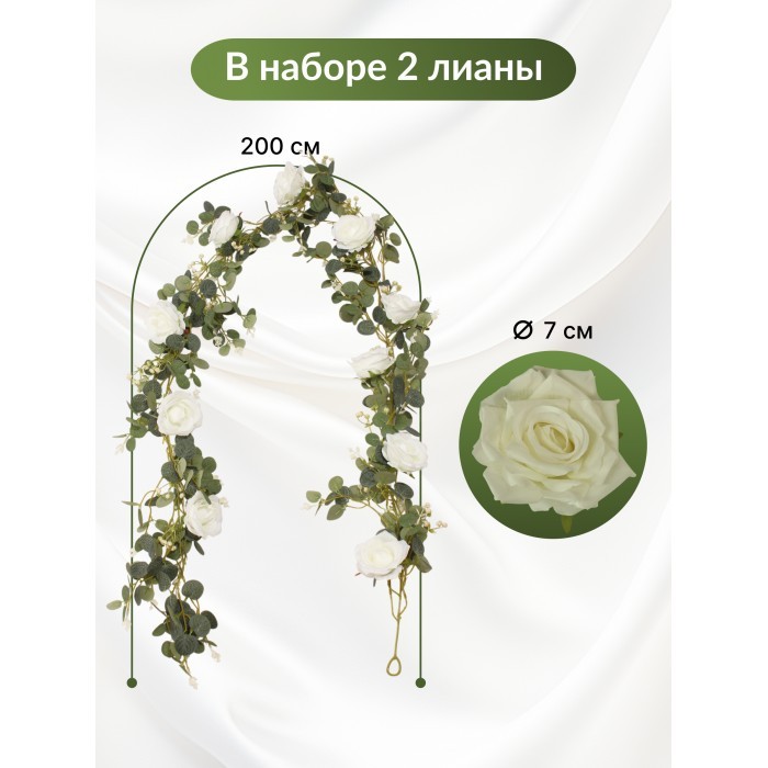 Цветы искуственные Розы Лиана (7см-10шт, 180 см, 2 ветки) белый 265913